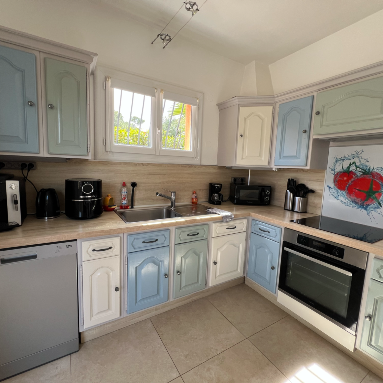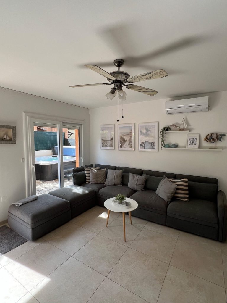 Notre maison offre un grand séjour climatisé, une cuisine entièrement équipée, 3 charmantes chambres climatisées : une avec un lit double, une avec un lit d'appoint et une avec deux lits simples (90 x 200 cm).